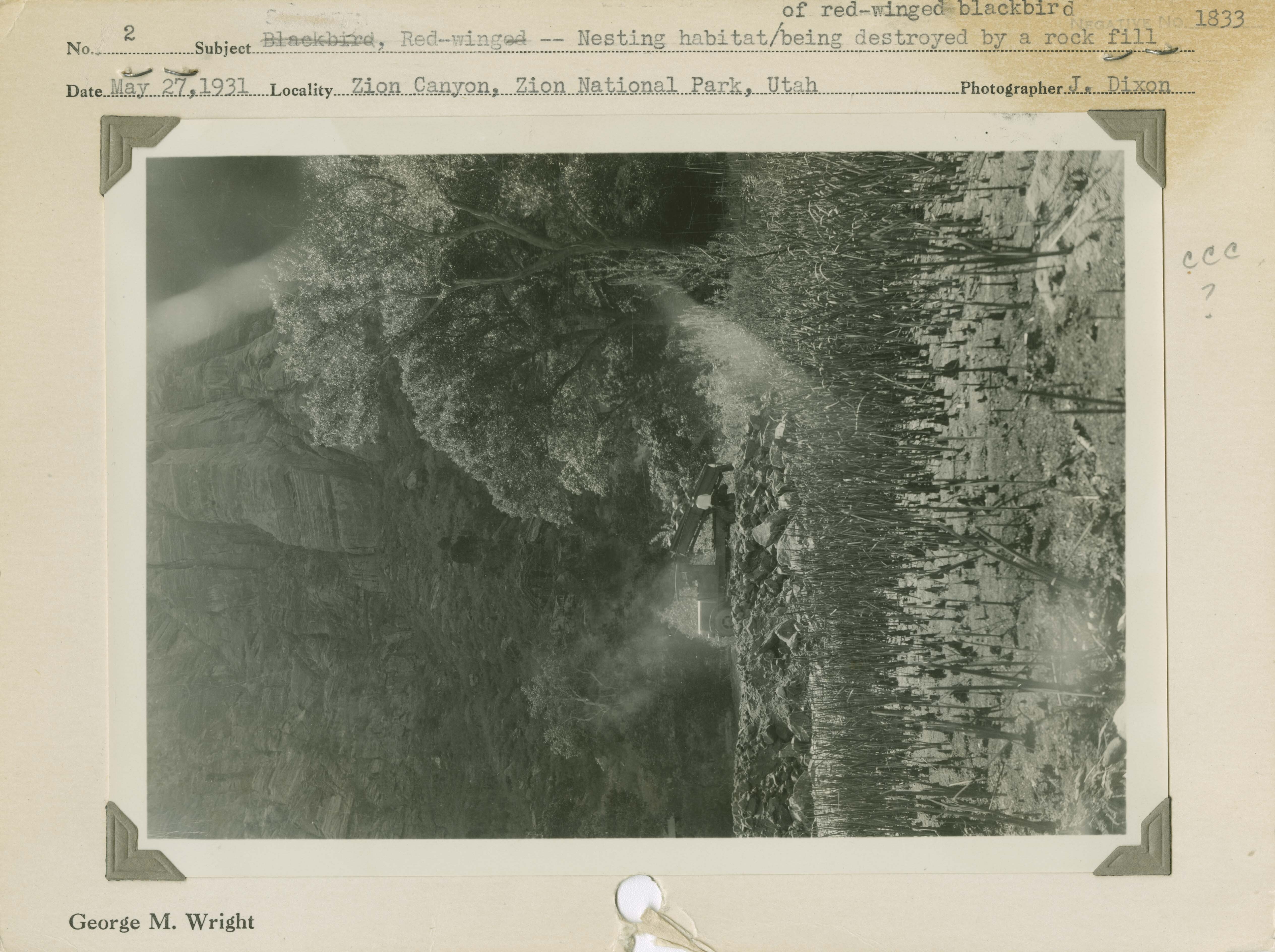 Blackbird, Red-winged -- Nesting habitat of red-winged blackbird being destroyed by a rock fill. The reverse of the story -- water-fowl nesting site makes way for road in Zion. Locality: Zion Canyon, Zion National Park, Utah. Negative #: 1833