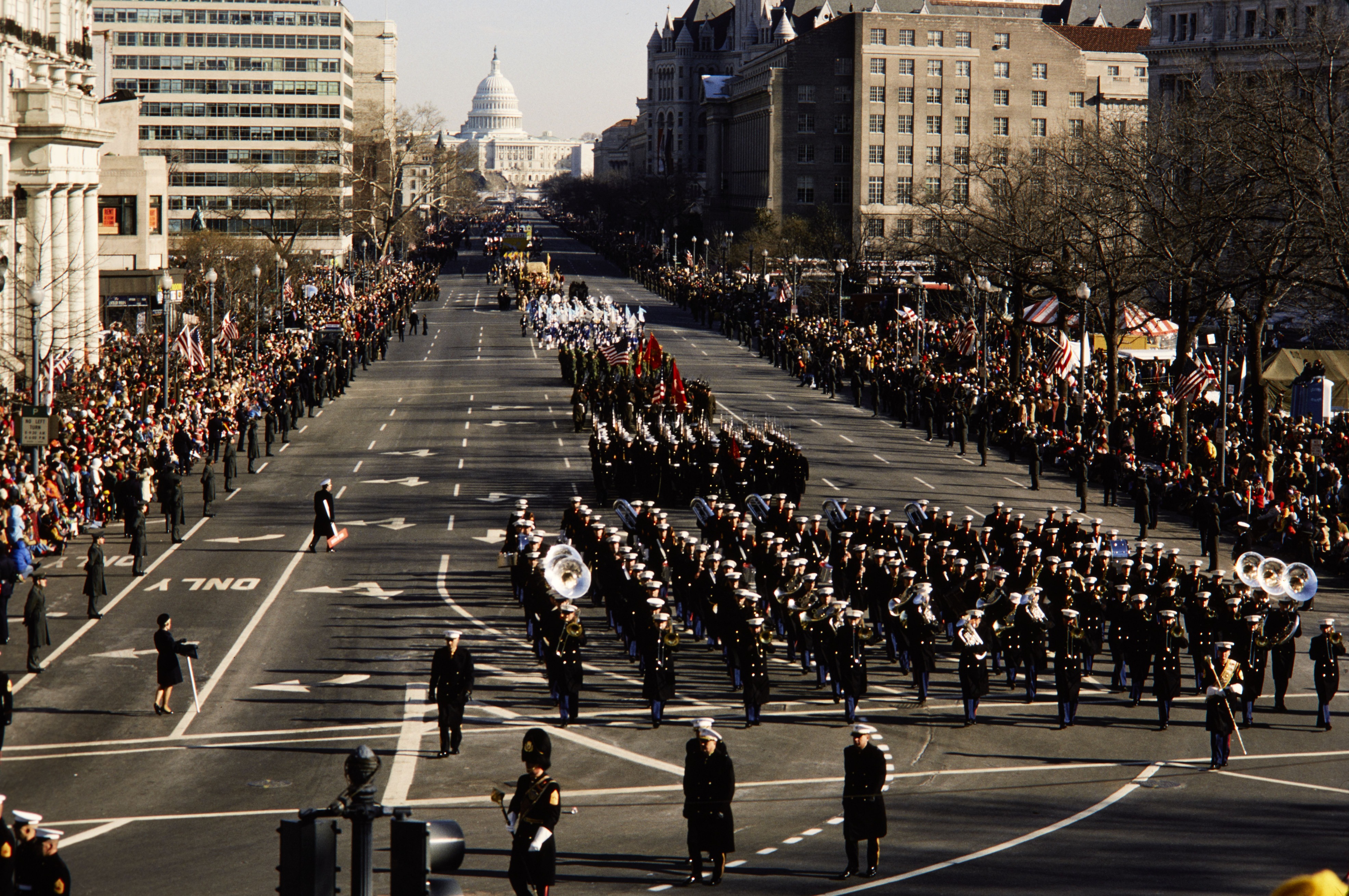 President Jimmy Carter's Inaugural Parade with a military marching band martching by on Pennsylvania Ave. in Washington, D.C.