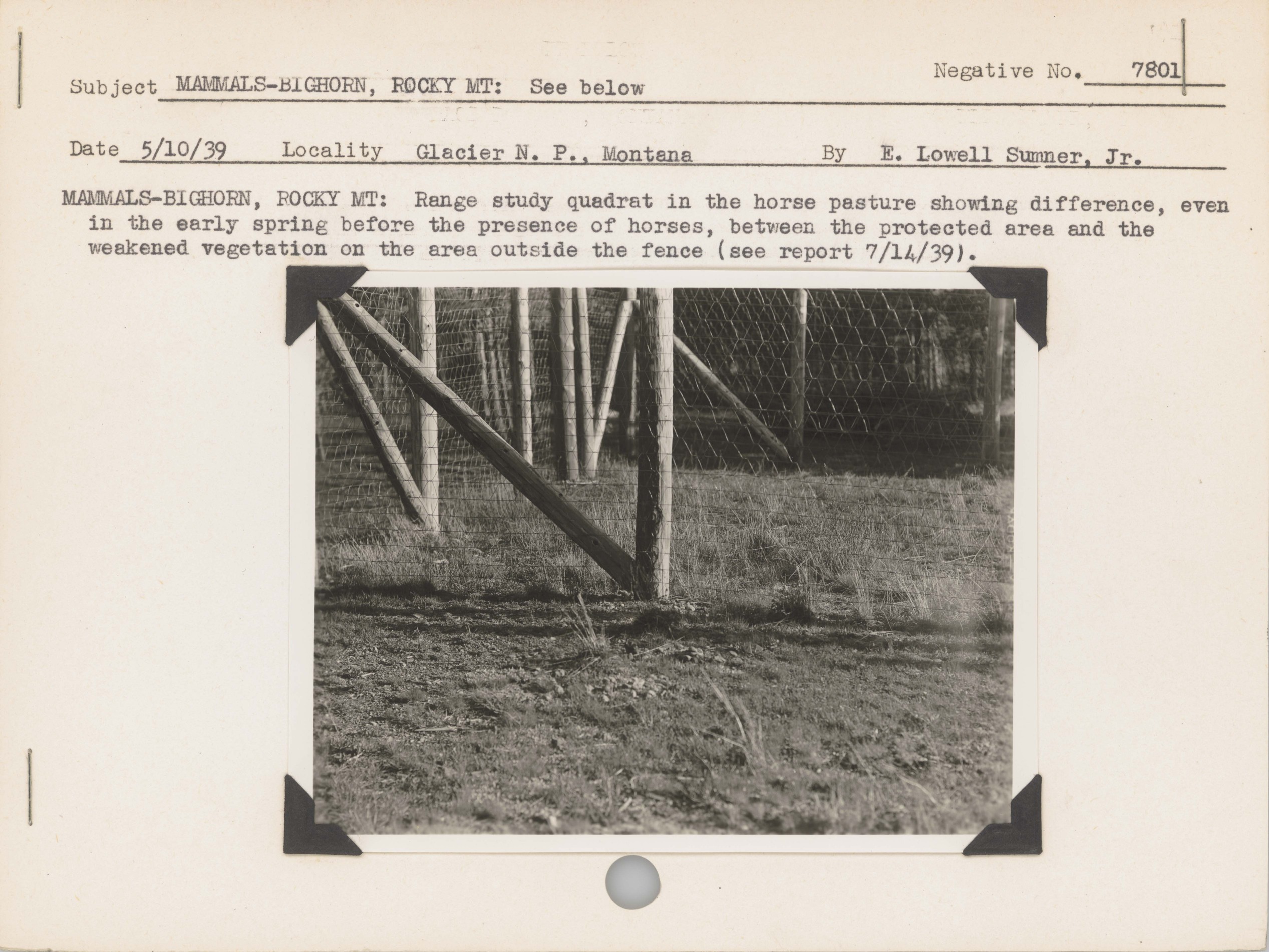 Mammals--Bighorn, Rocky Mountain--See below. Mammals--Bighorn, Rocky Mountain--Range study quadrat in the horse pasture showing difference, even in the early spring before the presence of horses, between the protected area and the weakened vegetation on the area outside the fence (see report 7/14/1939). Locality: Glacier National Park, Montana. Negative #: 7801