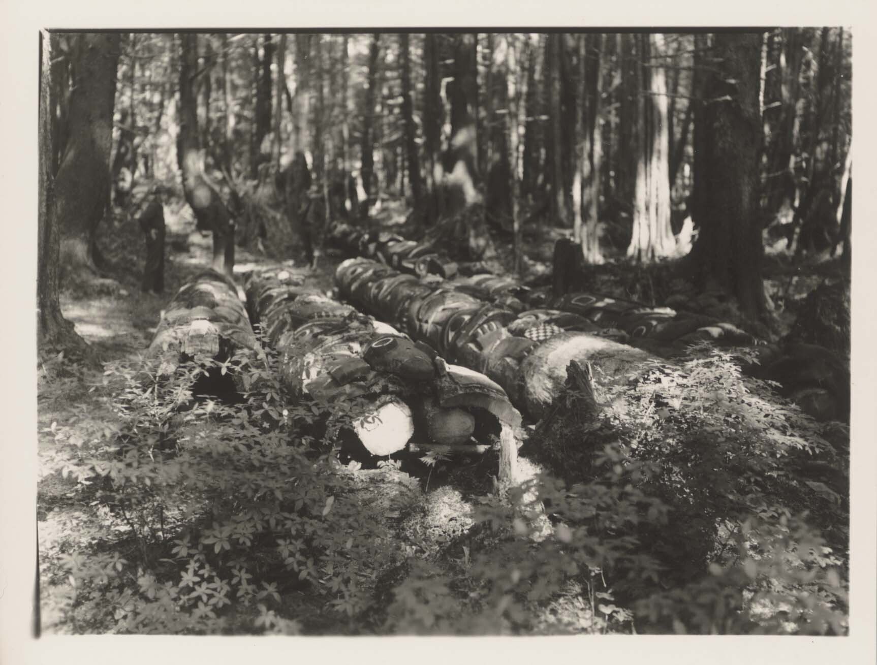 Original Totem Poles. Negative#: 10599. Location: Sitka National Monument. Location of negative: Wildlife Division, Directors Office. [This information comes from the reverse of the envelope for this negative number.].