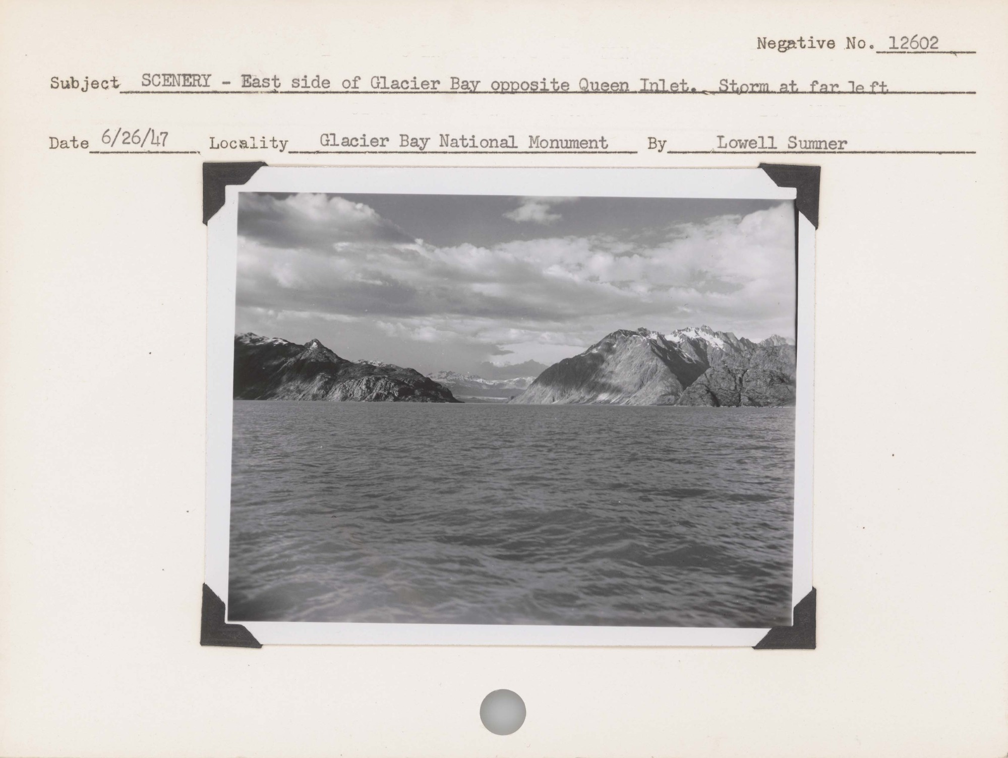 Scenery: East side of Glacier Bay opposite Queen Inlet. Storm at far left. Negative #: 12602. Locality: Glacier Bay National Monument.