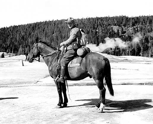 George Grant on horseback with equipment at Old Faithful, Yellowstone National Park.