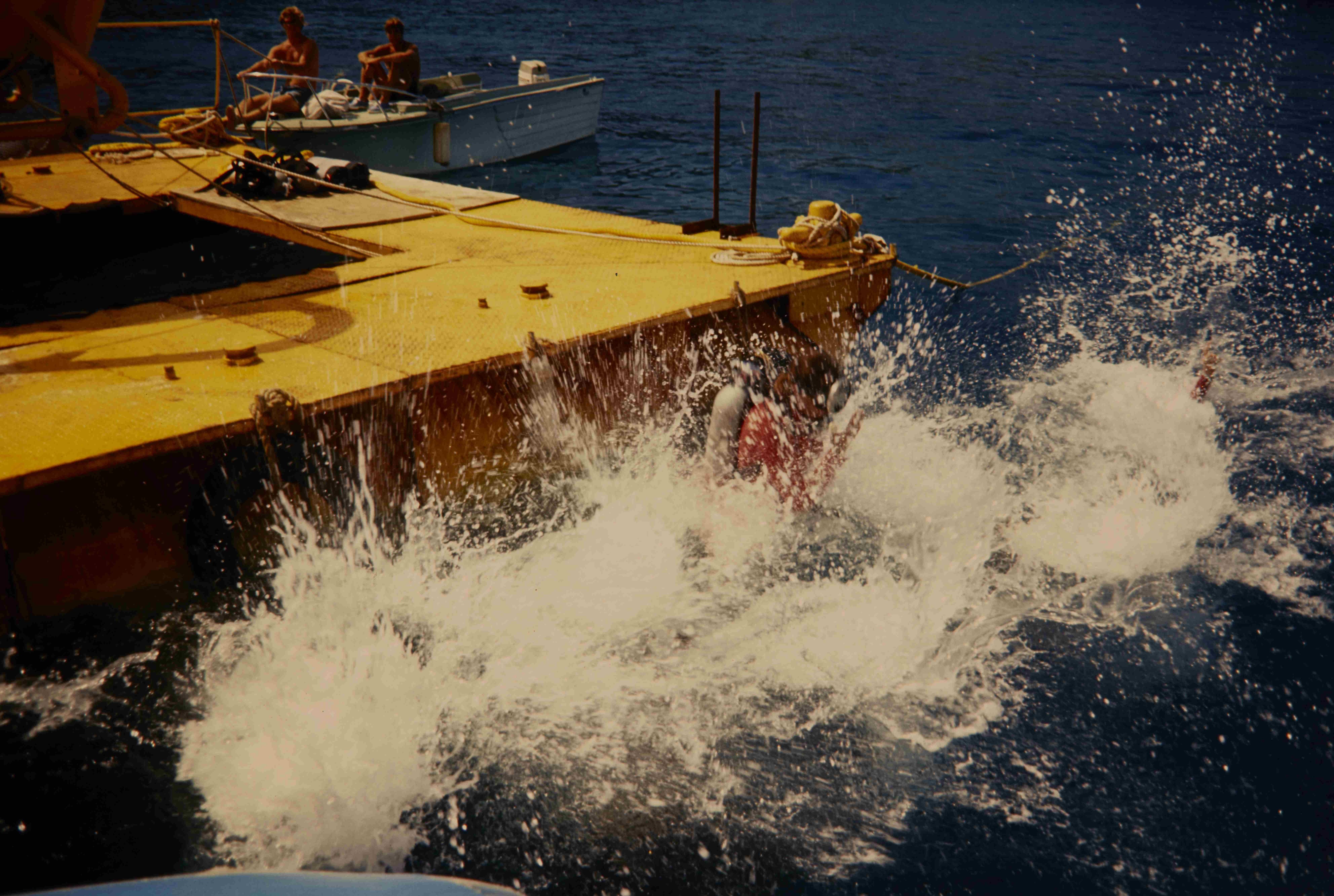 Divers jumping into the ocean during the Tektite II Project in Virgin Islands National Park.