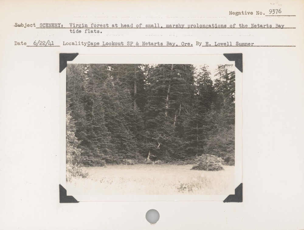 Scenery – Virgin forest at head of small, marsh prolongations of the Netarts Bay tide flats. Negative#: 9376. Location: Cape Lookout State Park and Netarts Bay, Oregon.