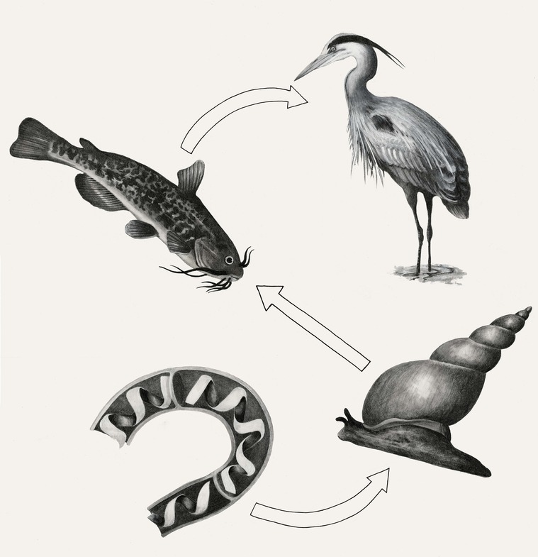 Energy producers are presented in order of being consumed from bottom upwards: algae (cutaway), snail, catfish, and Great Blue heron