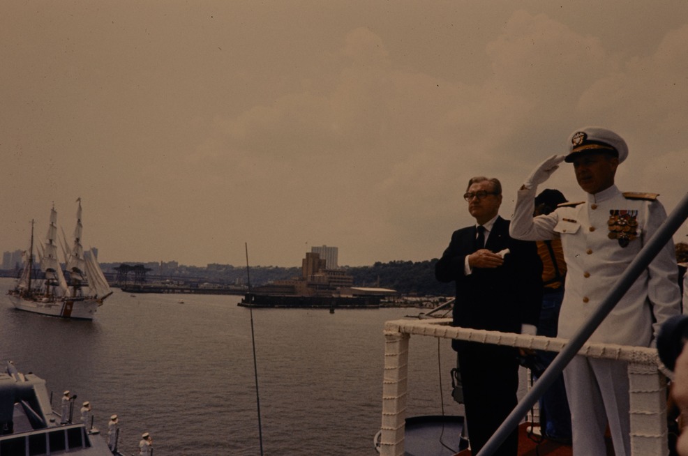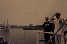 Visitors next to a U.S. Navy officer saluting from a boat in Gateway National Recreation Area.