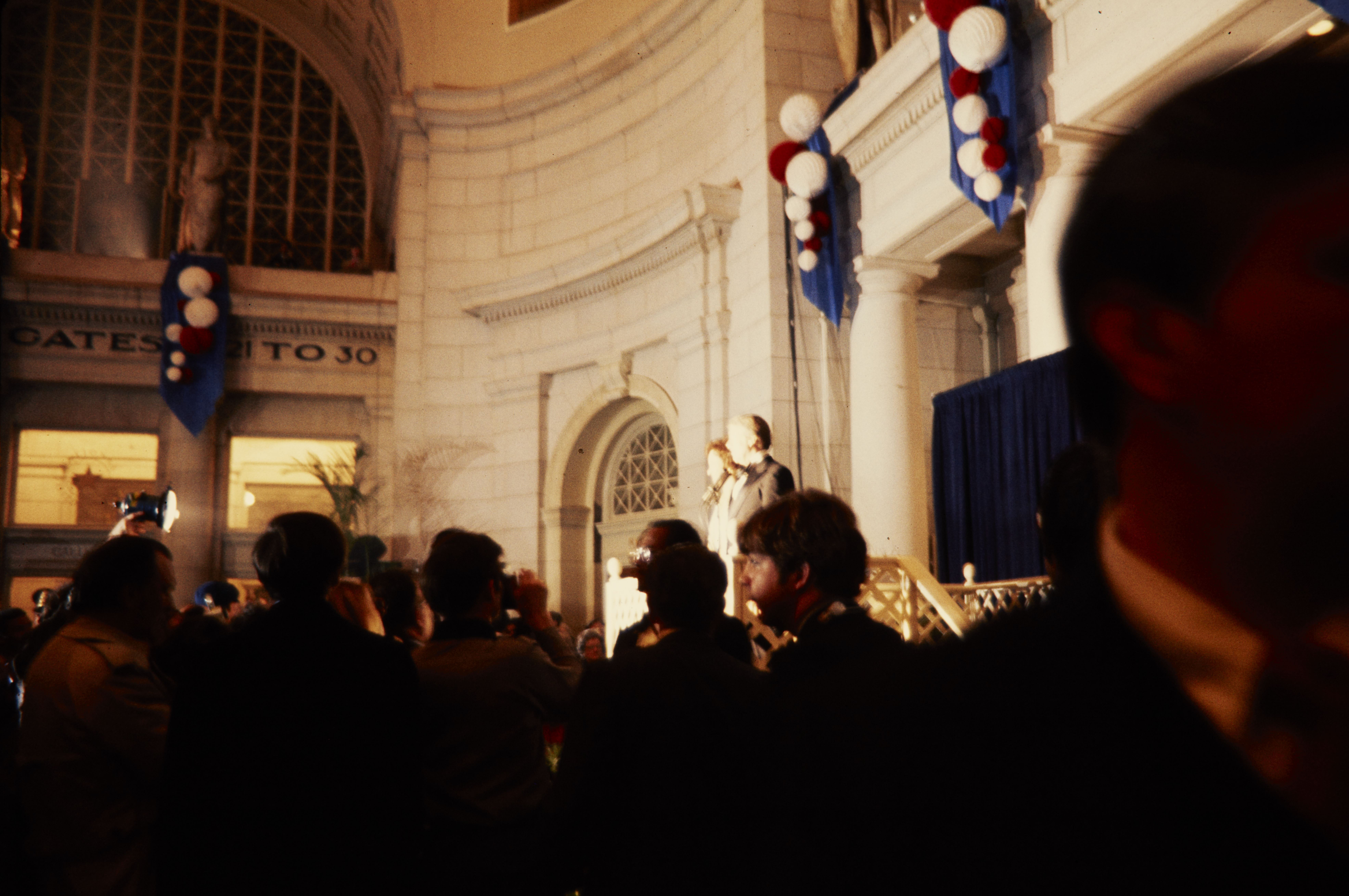 President Jimmy Carter and First Lady Rosalynn Carter standing on a balcony surrounded by secret service agents in Union Station in Washington, D.C.