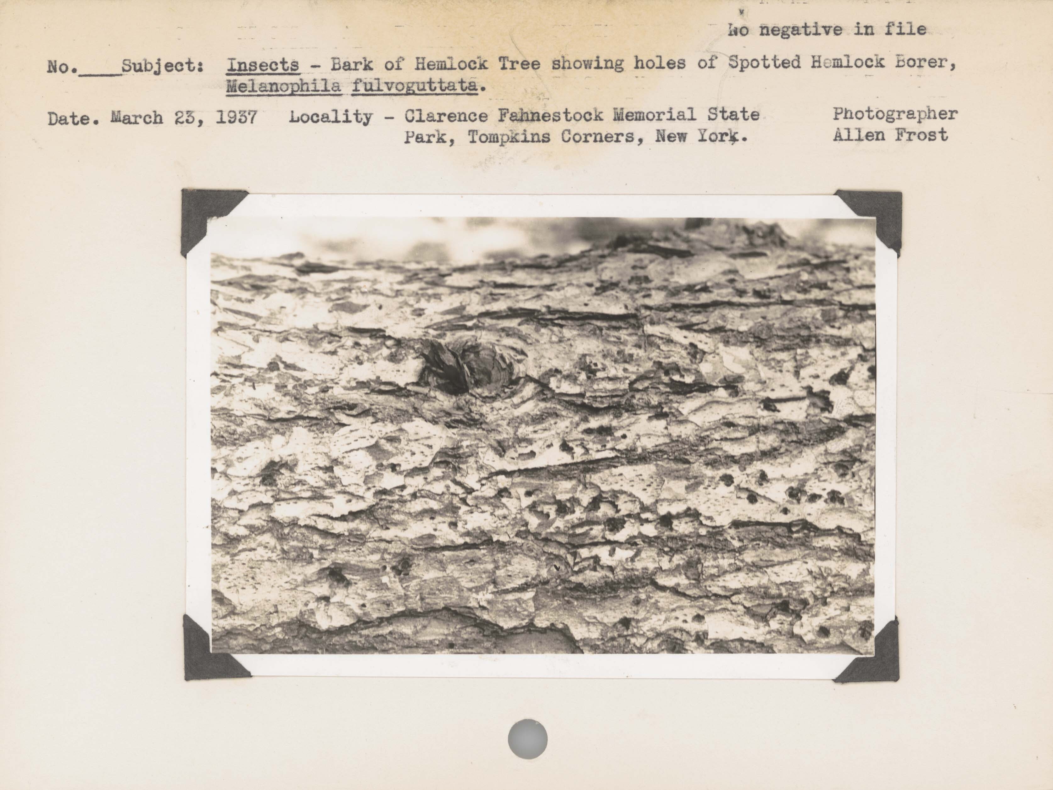 Insects--Bark of Hemlock Tree showing holes of Spotted Hemlock Borer, Melanophila fulvoguttata. Locality: Clarence Fahnestock Memorial State Park, Tompkins Corners, New York. No Negative on File