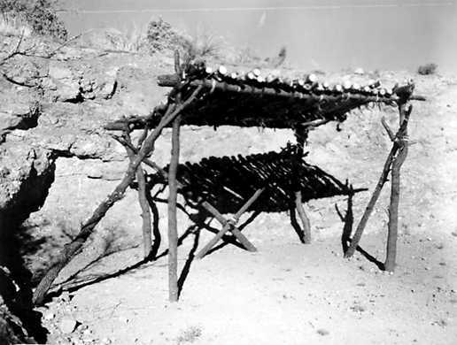 Ramada, Mexican style, that is constructed of nothing but wood and rawhide strips. Coronado National Memorial.