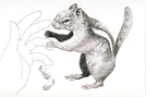 Golden-mantled Ground squirrel biting the hand of a person offering food (peanuts).