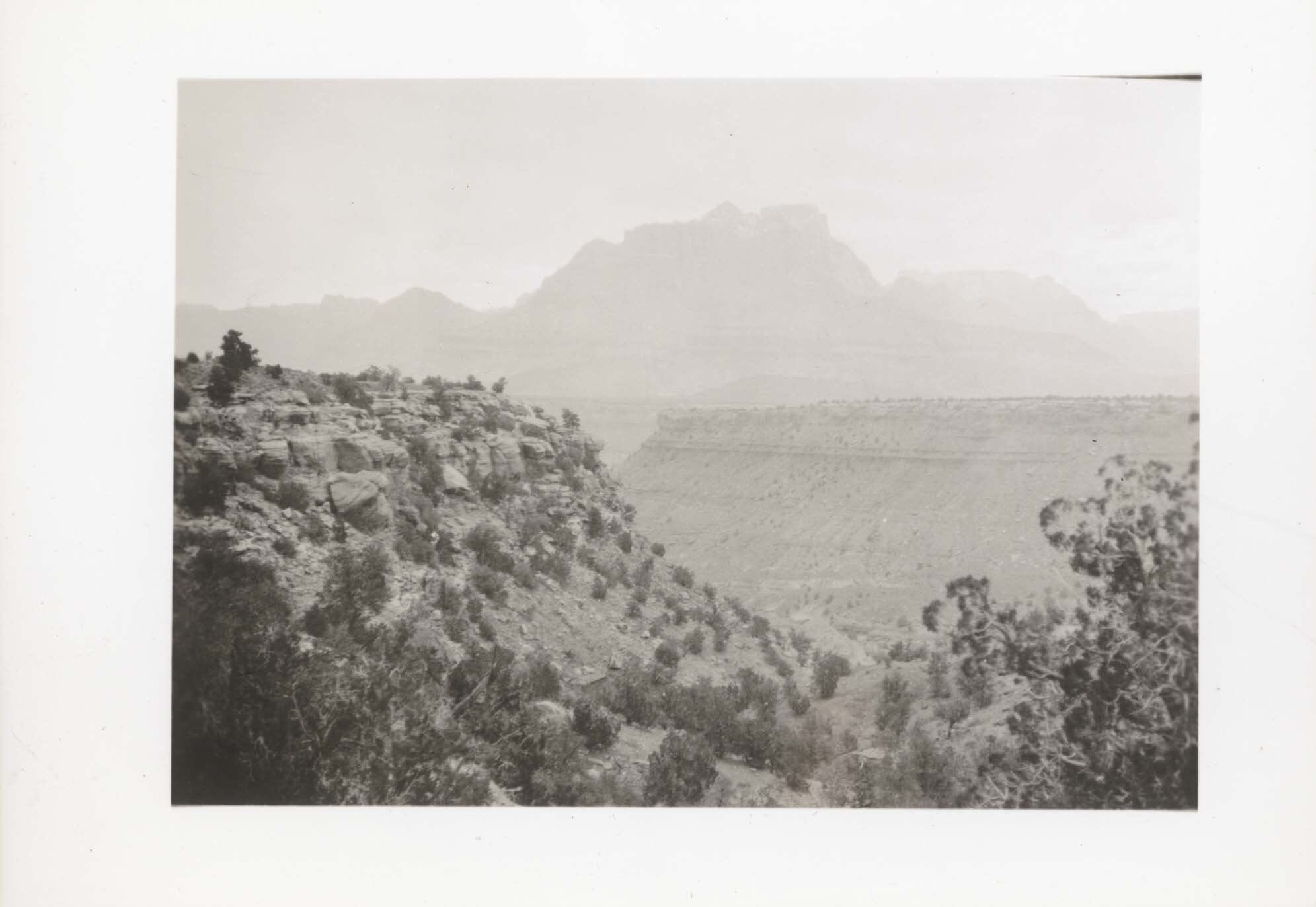 Scenery – Winter range in protected canyons below the rim. Negative#: 1129. Location: near Pipe Springs National Monument. Location of negative: Region Four Headquarters. [This information comes from the reverse of the envelope for this negative number.].