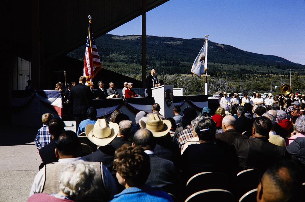 NPS Director George B. Hartzog, Jr. giving a speech on a stage at Glacier National Park.