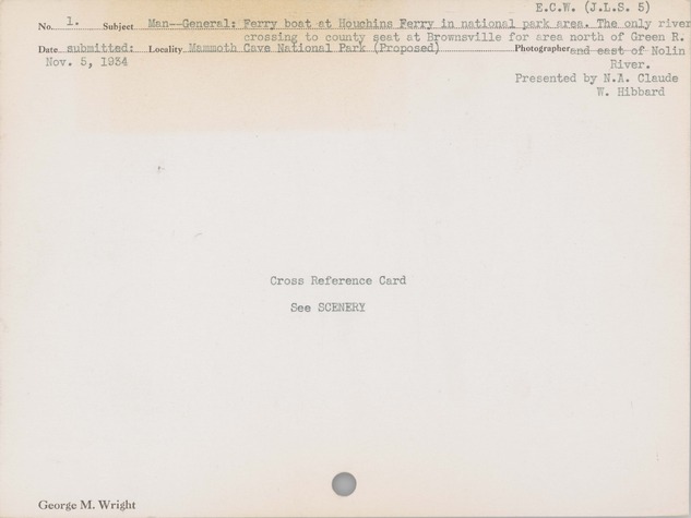 Man--General--Ferry boat at Houchins Ferry in national park area. The only river crossing to county seat at Brownsville for area north of Green River and east of Nolin River. Locality: Mammoth Cave National Park (Proposed). Negative #: ecw-jls5. [Emergency Conservation Work]. Presented by N.A. Claude W. Hibbard. Cross reference card, see scenery