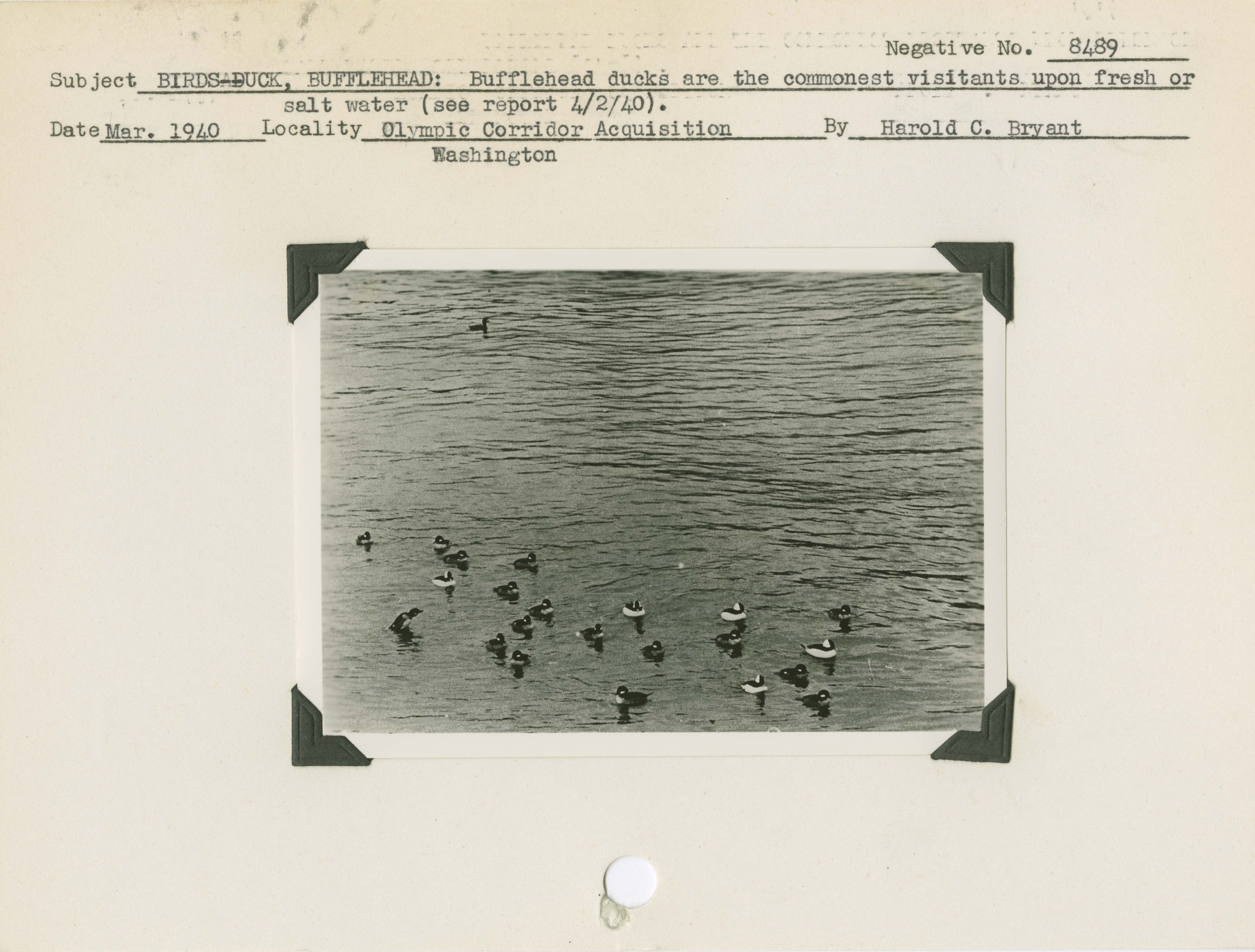 Birds -- Duck, Bufflehead: Bufflehead ducks are the commonest visitants upon fresh or salt water (see report 4/2/40). Locality: Olympic Corridor Acquisition, Washington. Negative #: 8489