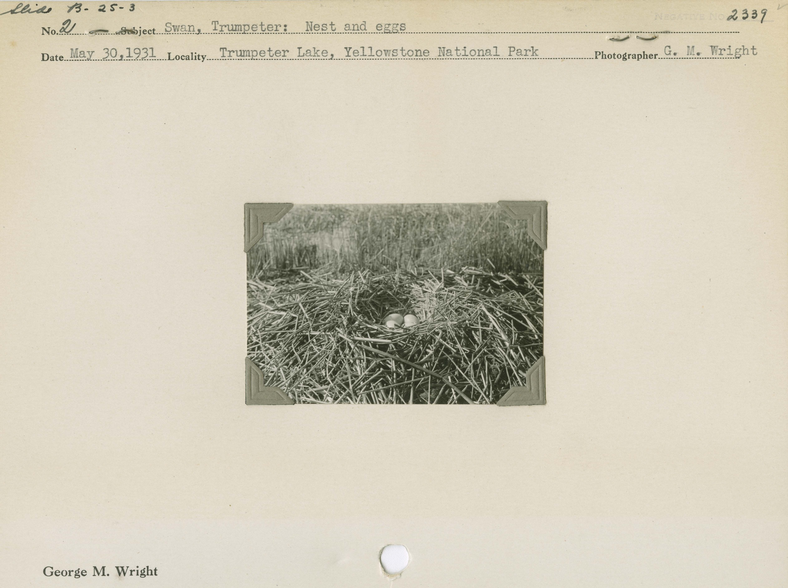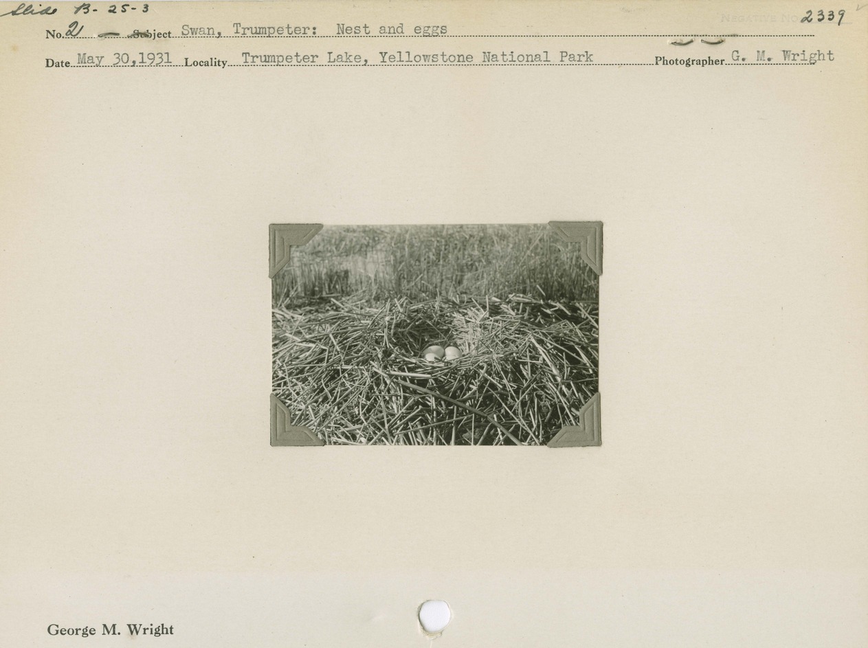 Swan, Trumpeter: Nest and eggs. Locality: Trumpeter Lake, Yellowstone National Park. Negative #: 2339