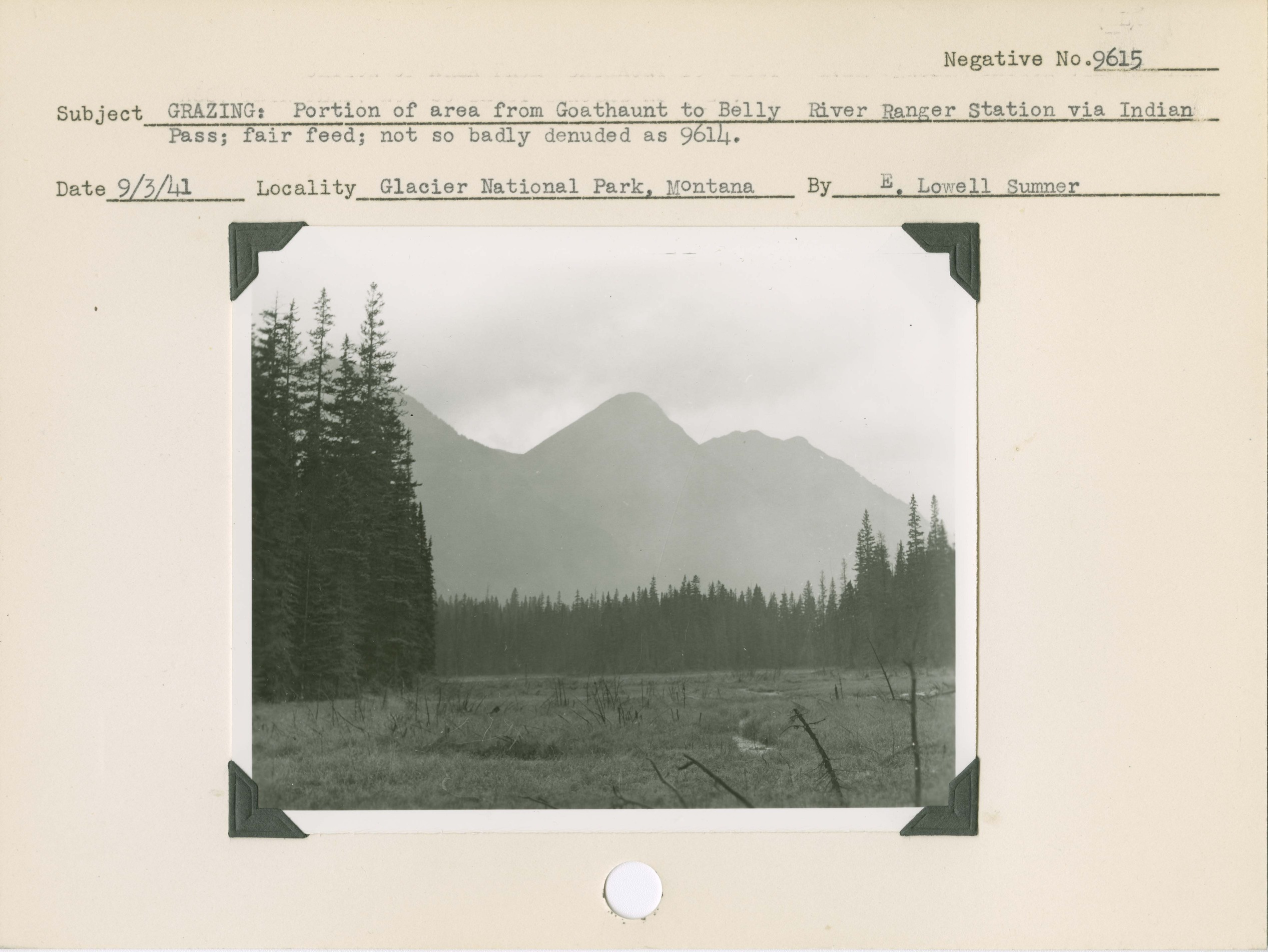 Grazing: Portion of area from Goathaunt to Belly River Ranger Station via Indian Pass; fair feed, not so badly denuded as negative number 9614. Locality: Glacier National Park, Montana. Negative #: 9615