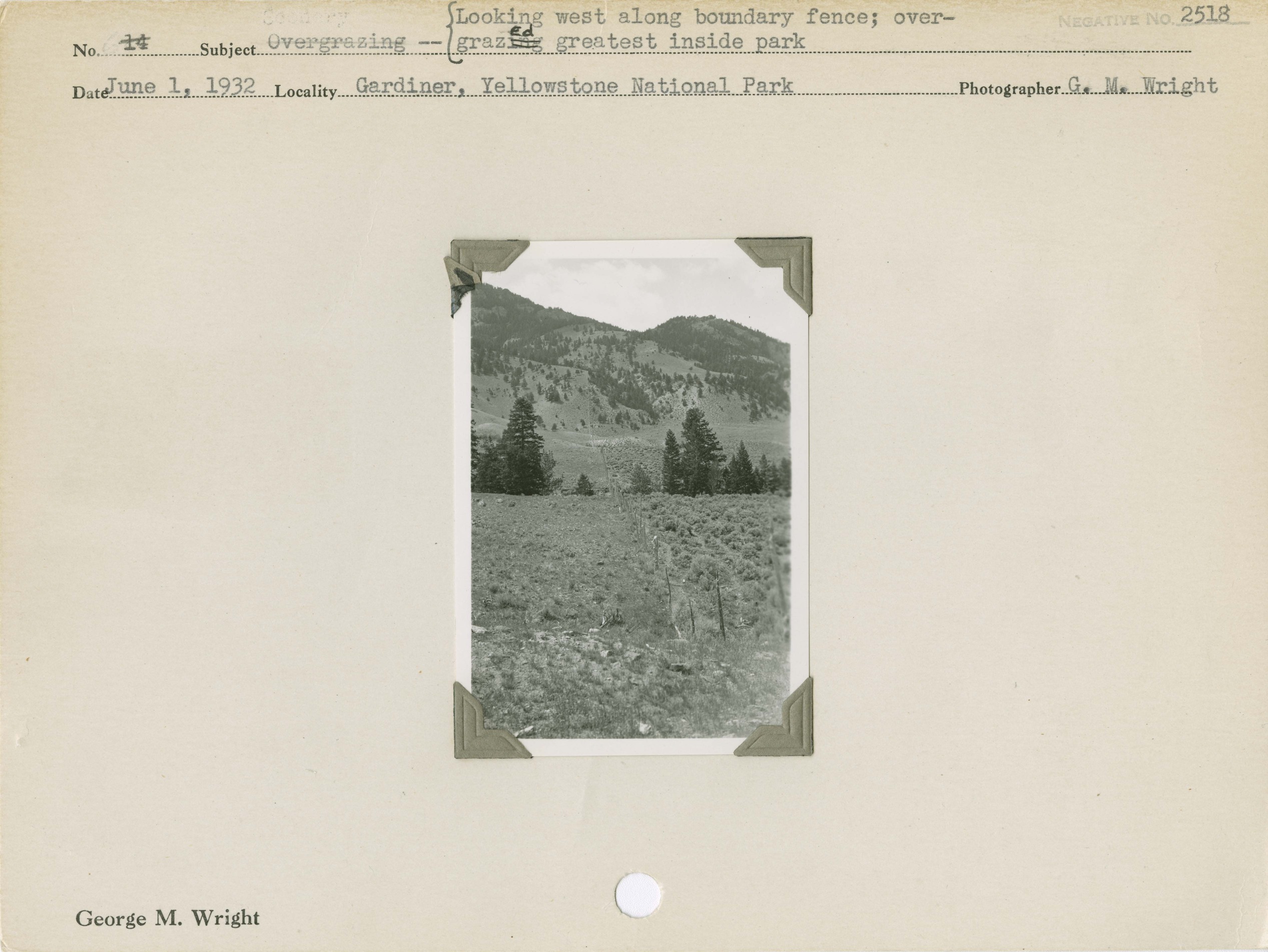 Overgrazing -- Looking west along boundary fence; over-grazing greatest inside park. Locality: Gardiner, Yellowstone National Park. Negative #: 2518