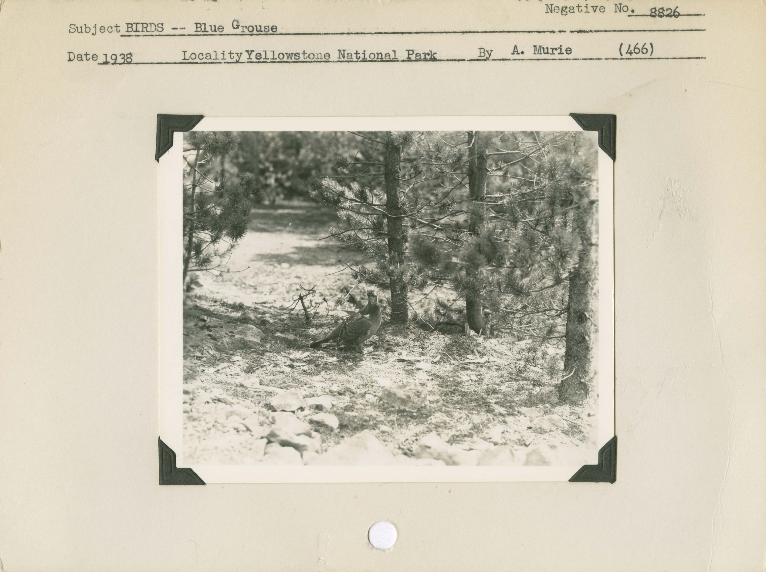 Birds -- Blue Grouse. Locality: Near Norris, Yellowstone National Park. Negative #: 8826. [Other photos in this series have a date of 05/06/1938]