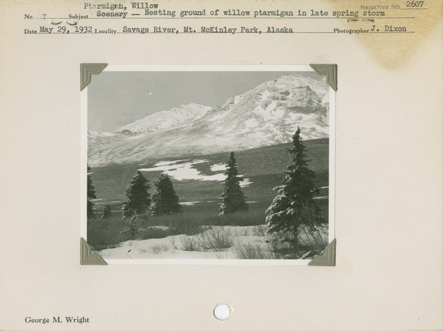 Ptarmigan, Willow -- Nesting ground of willow ptarmigan in late spring storm. Locality: Savage River, Mount McKinley [Denali] National Park, Alaska. Negative #: 2607