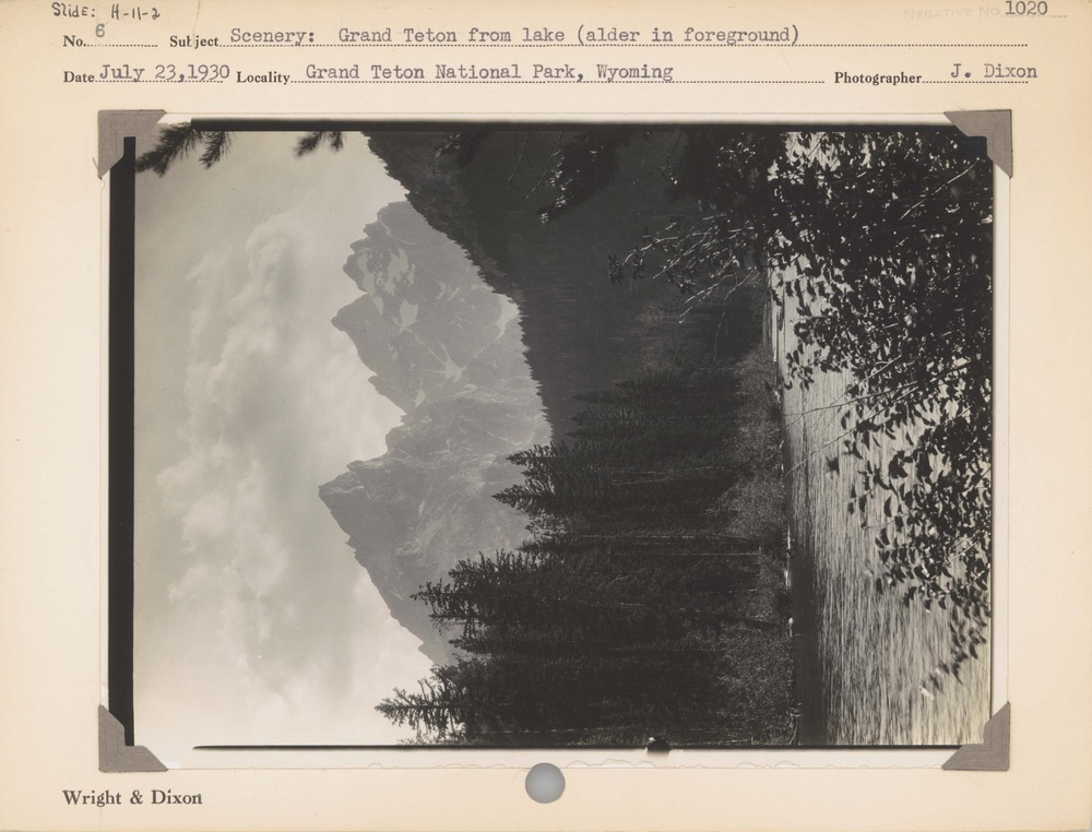 Scenery: Grand Teton from lake (alder in foreground). Negative #: 1020. Locality: Grand Teton National Park, Wyoming.