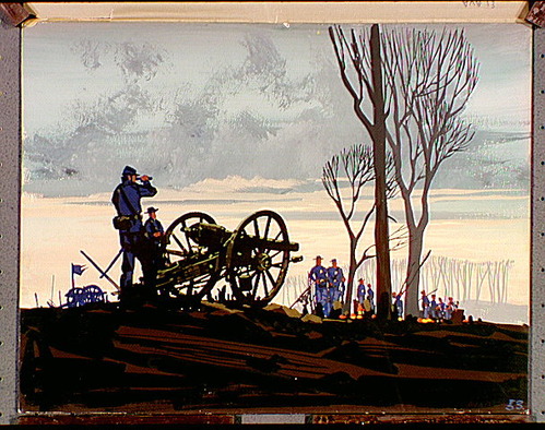 Troops around a cannon overlooking battlefield in front of trees.