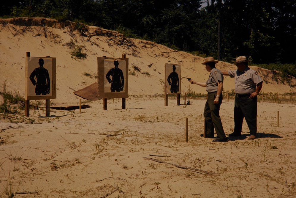 U.S. Park Police, Edwin Lambert, practicing at a shooting range in Indiana Dunes National Park.