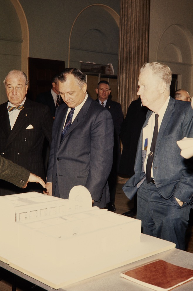 Secretary of the Interior Hickel walking around Independence National Historical Park.
