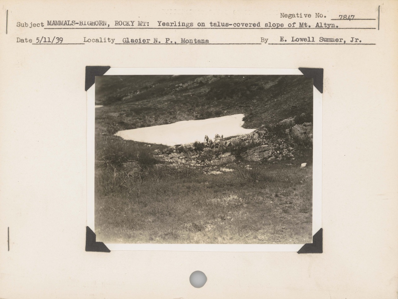 Mammals--Bighorn, Rocky Mountain--Yearlings on talus-covered slope of Mount Altyn. Locality: Glacier National Park, Montana. Negative #: 7847