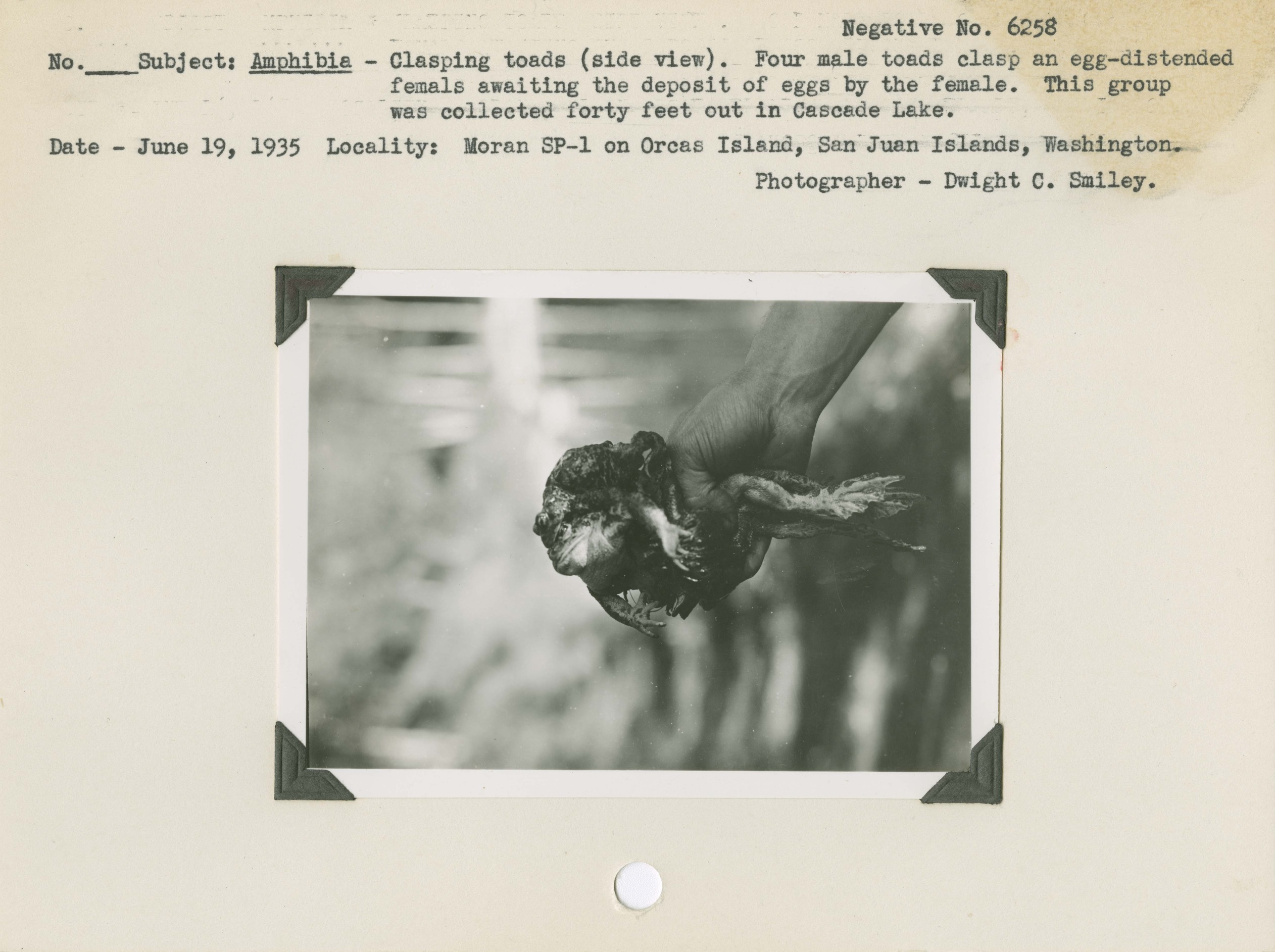 Amphibia - Clasping toads (side view). Four male toads clasp an egg-distended female awaiting the deposit of eggs by the female. This group was collected about forty feet out in Cascade Lake. Locality: Moran State Park 1 (SP-1) on Orcas Island, San Juan Islands, Washington. Negative #: 6258