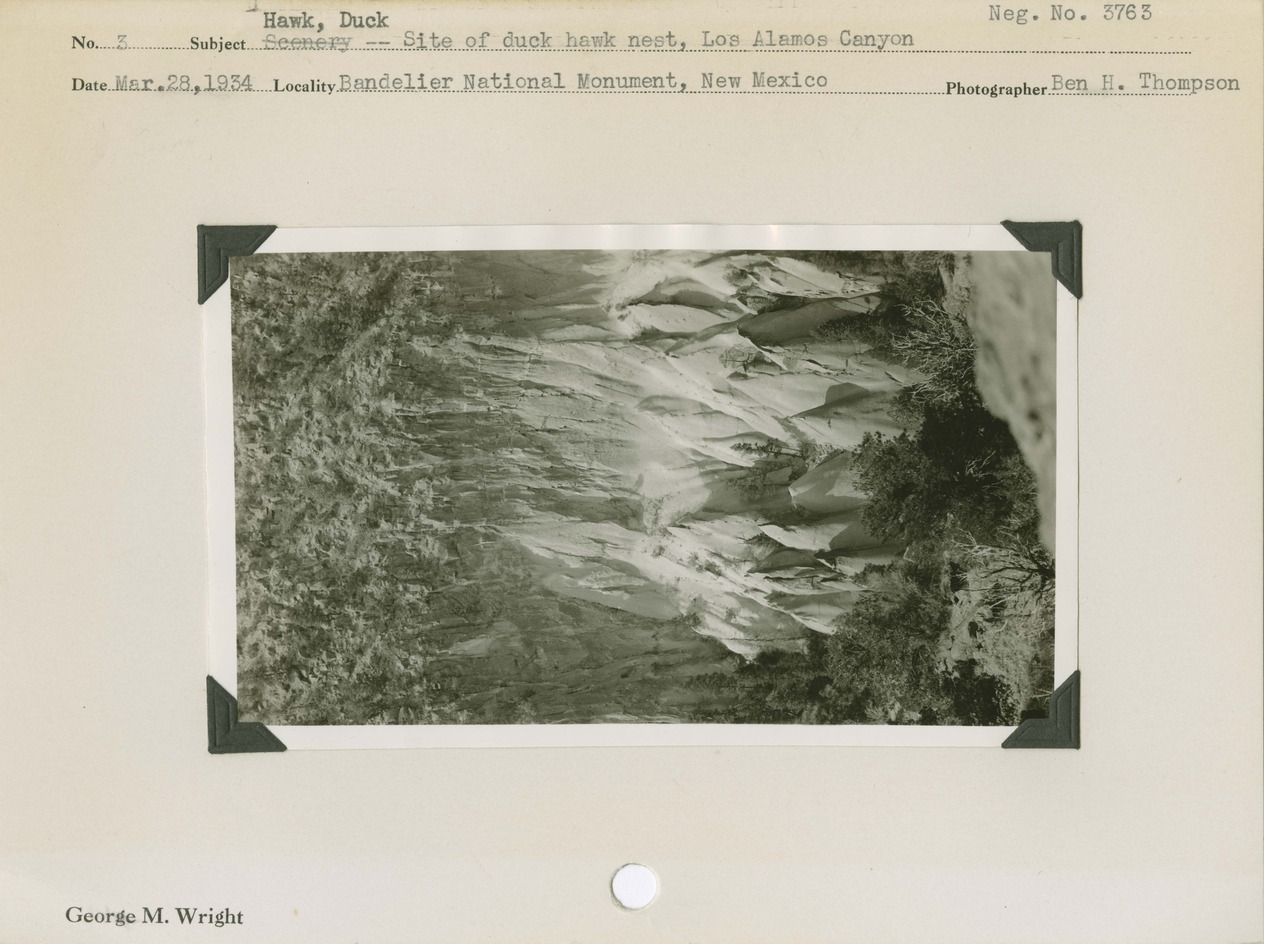 Hawk, Duck -- Site of duck hawk nest, Los Alamos Canyon. Locality: Bandelier National Monument, New Mexico. Negative #: 3763