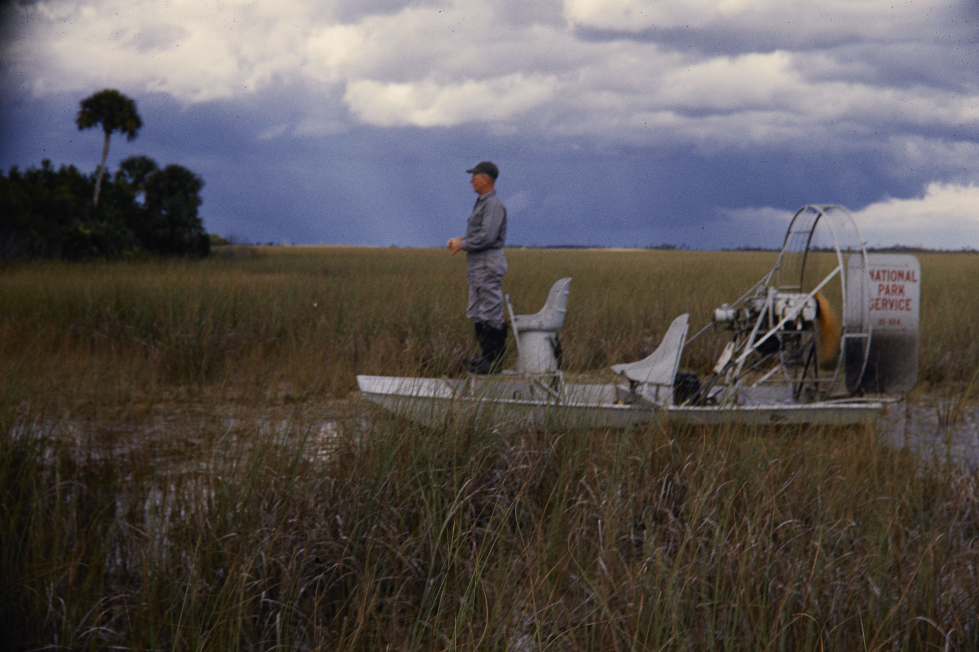 NPS employee riding on an airboat through Everglades National Park.
