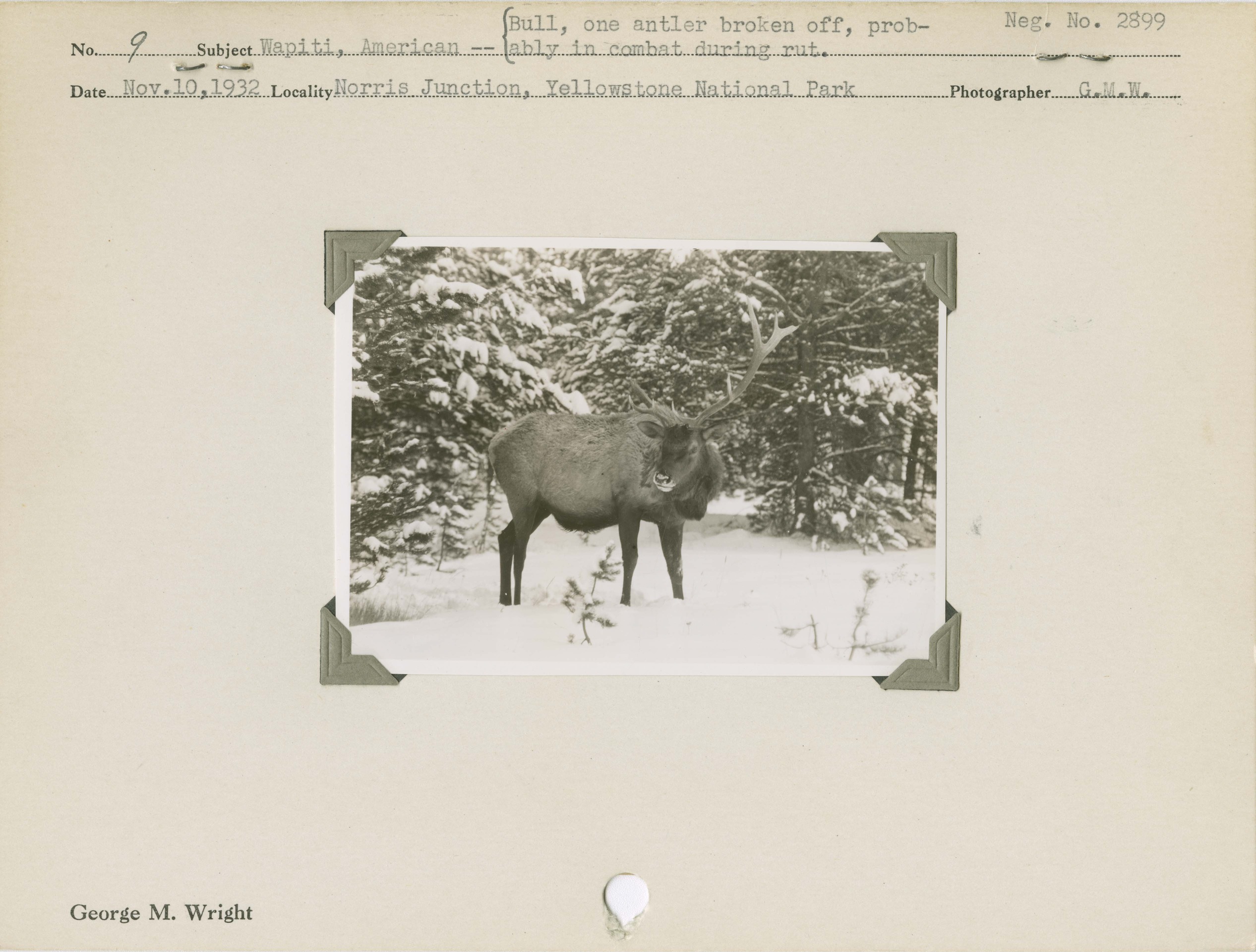 Wapiti, American [Elk]– Bull, one antler broken off, probably in combat during rut. Negative #: 2899. Locality: Norris Junction, Yellowstone National Park.