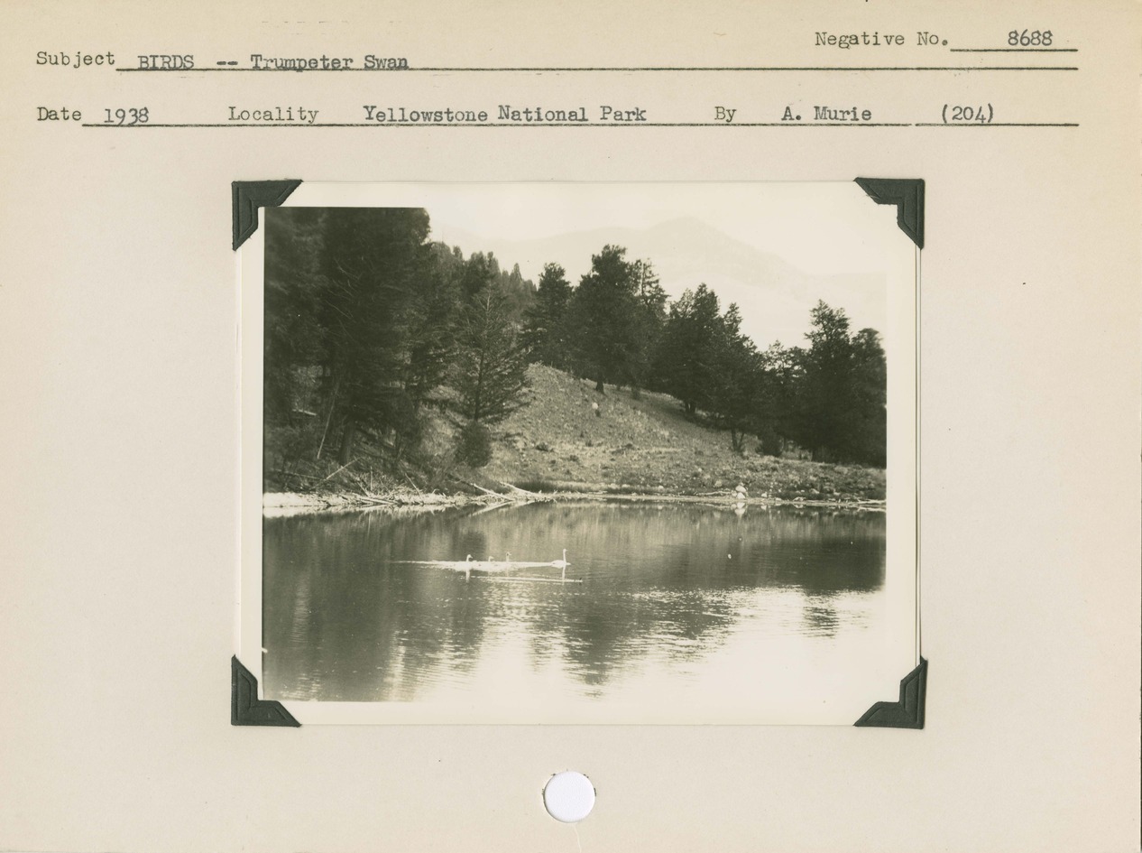 Birds -- Trumpeter Swan. Locality: Geode Lake, Yellowstone National Park. Negative #: 8688. [Reverse of card has the more specific date]