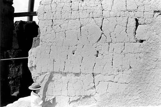 The outside of the east wall of the main building showing layer construction, the caliche material having been worked and built up in two foot tiers. No forms or mold were used. Work on the whole building was entirely by hand. Casa Grande Ruins National Monument.