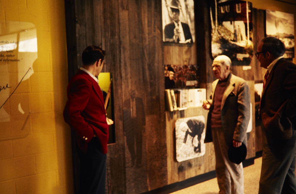 Freeman Tilden talking to two other men while walking through an exhibit based on Tilden.