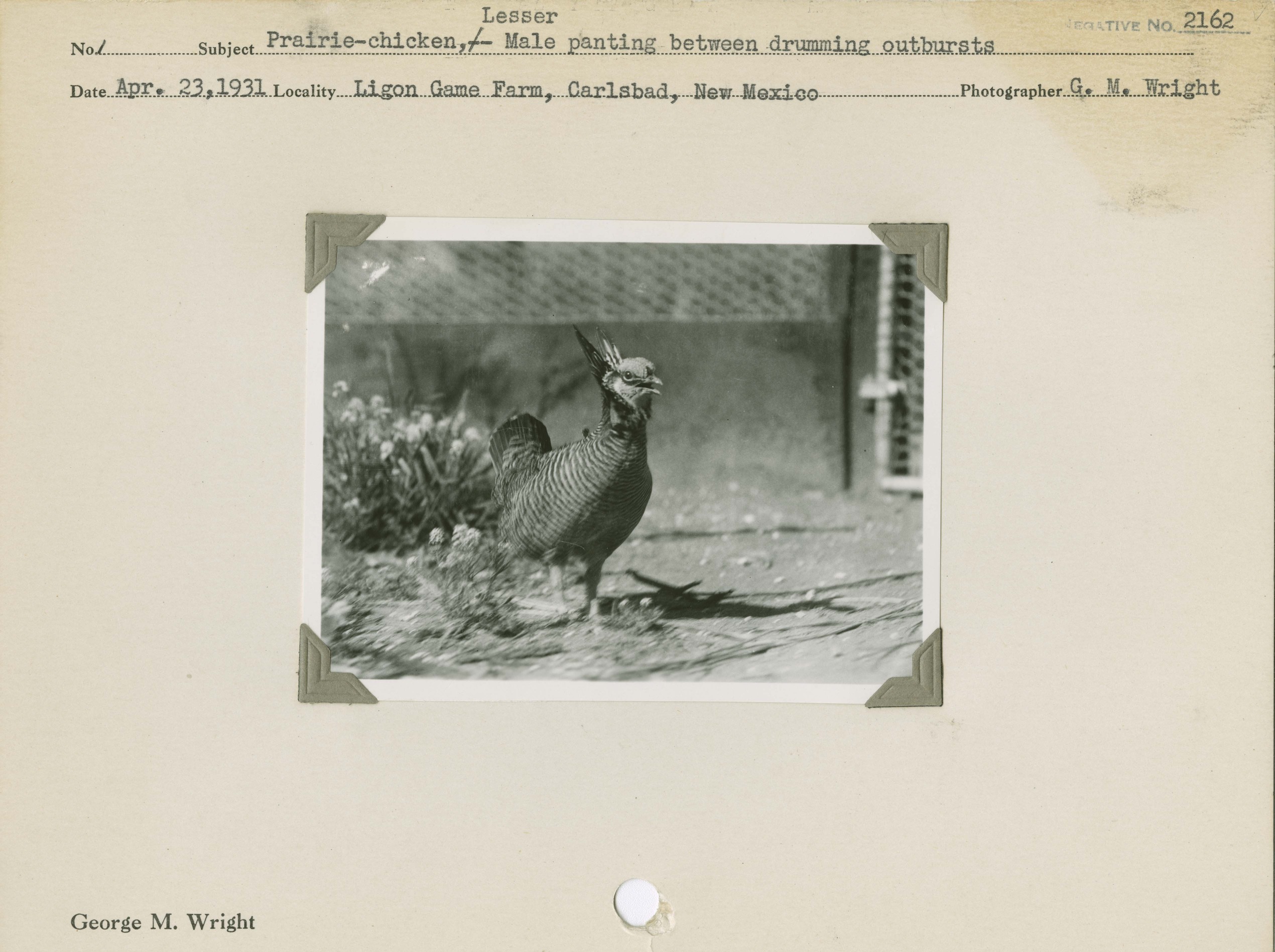 Prairie Chicken, Lesser -- Male panting between drumming outbursts. Locality: Ligon Game Farm, Carlsbad, New Mexico. Negative #: 2162