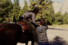 NPS employee on horseback helping a visitor with a map in Yosemite National Park.