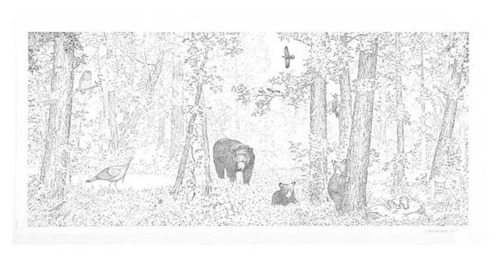 Animal species depicted include a Veery, a Barred owl, a Wild turkey, a Black bear sow and two cubs, a Scarlet tanager, a raven, a Pileated woodpecker, a Timber rattlesnake, a Hooded warbler, and a bobcat