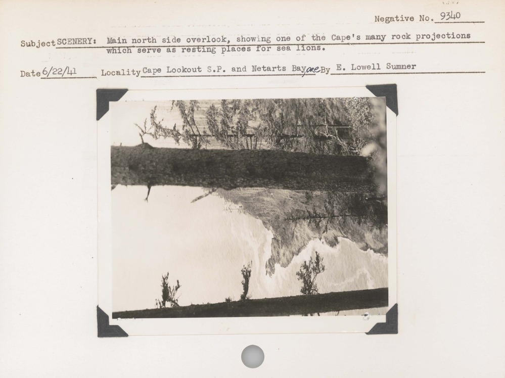 Scenery – Main north side overlook, showing one of the Cape’s many rock projections which serve as resting places for sea lions. Negative#: 9340. Location: Cape Lookout State Park and Netarts Bay, Oregon.