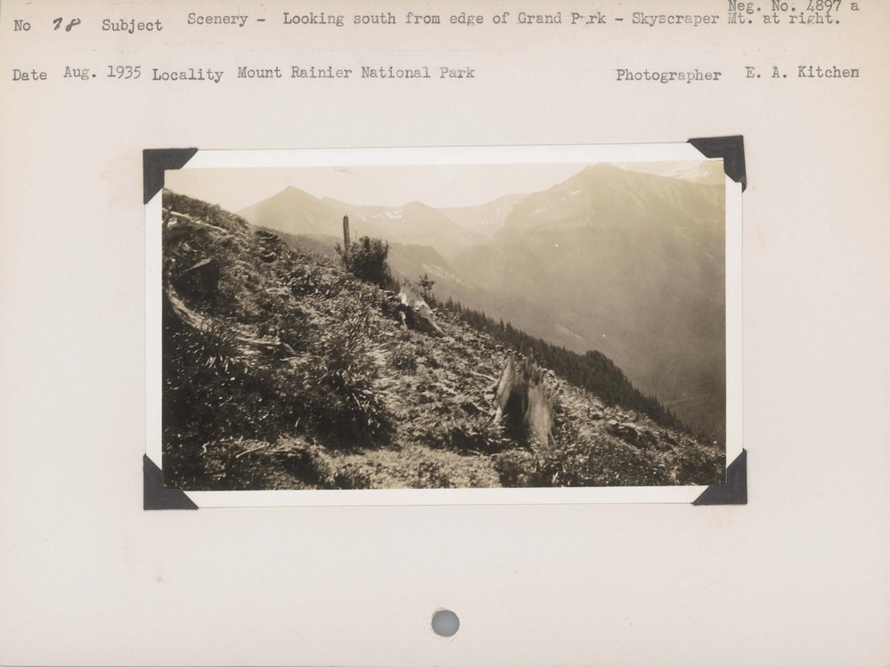 Scenery – Looking south from edge of grand Park – Skyscraper Mountain at right. Negative #: 4897. Location: Mount Rainier National Park.