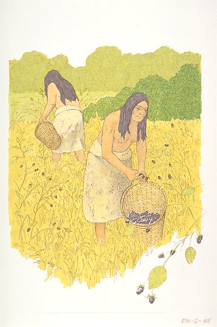 Native American Indian women collecting berries in baskets.