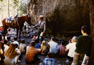 NPS ranger standing next to a horse talking to children during a Junior Ranger Program in Yosemite National Park.