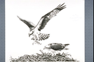 An osprey nest with two osprey one perched in nest and one flying towards nest with a fish in its talons.