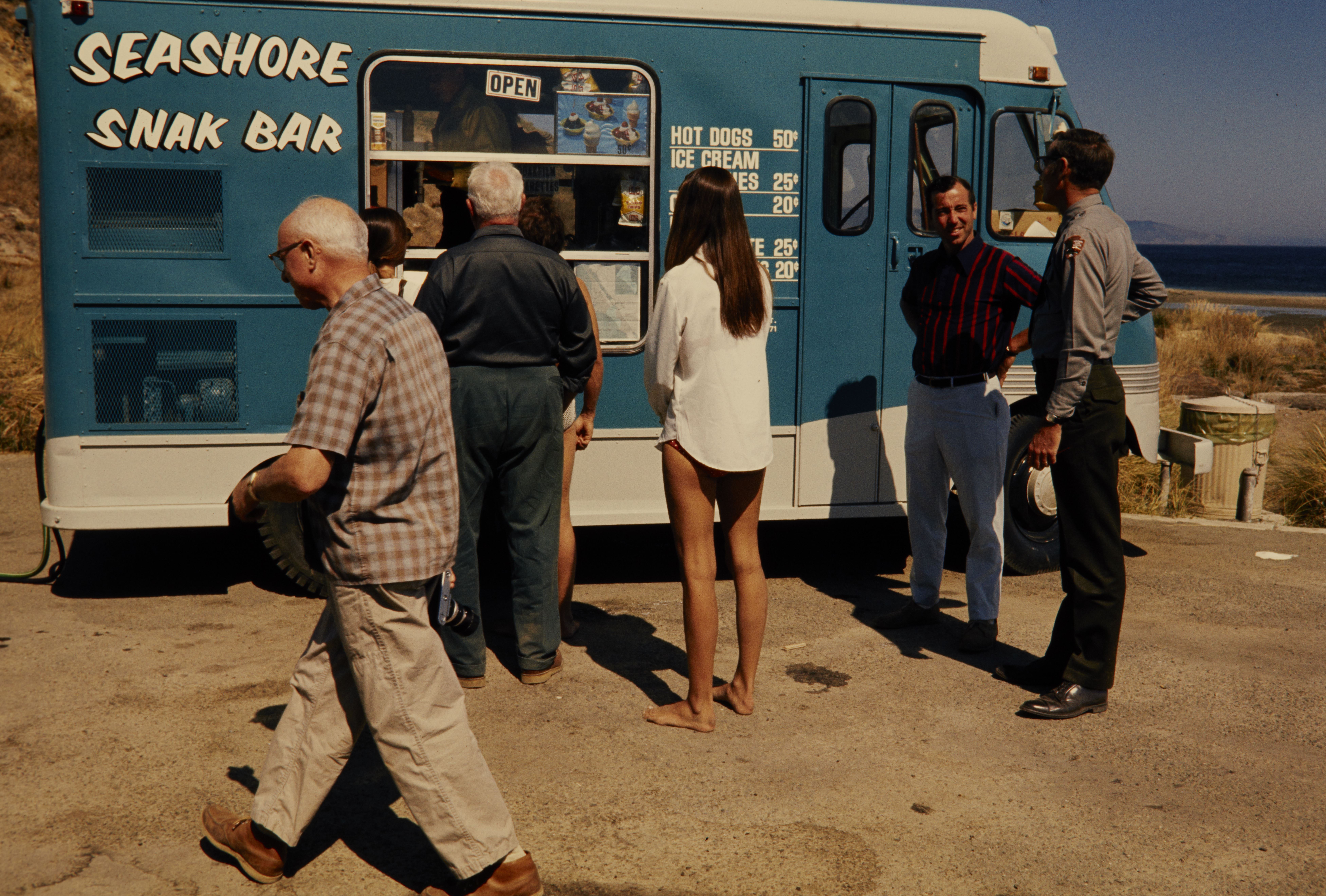 Visitors and NPS employee ordering from the Seashore Snak Bar food truck in Point Reyes National Seashore.