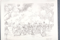 Gen. Daniel Ruggles' artillery batteries in action at the edge of the woods firing into the Union positions along the Sunken Road and the thickets during the Battle of Shiloh; the area of the Union positions later became known as the "Hornets' Nest.