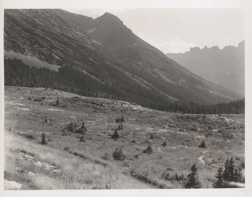 Fire Hazard: Many Glacier burned-over area-subsequently cleaned up. In the distance are several areas not yet cleaned up because of lesser hazard. Negative #: 7194-b. Locality: Many Glacier Hotel, Glacier National Park, Montana. [This information comes from negative # hfca_1607_iva_025_36_007_7194a.].