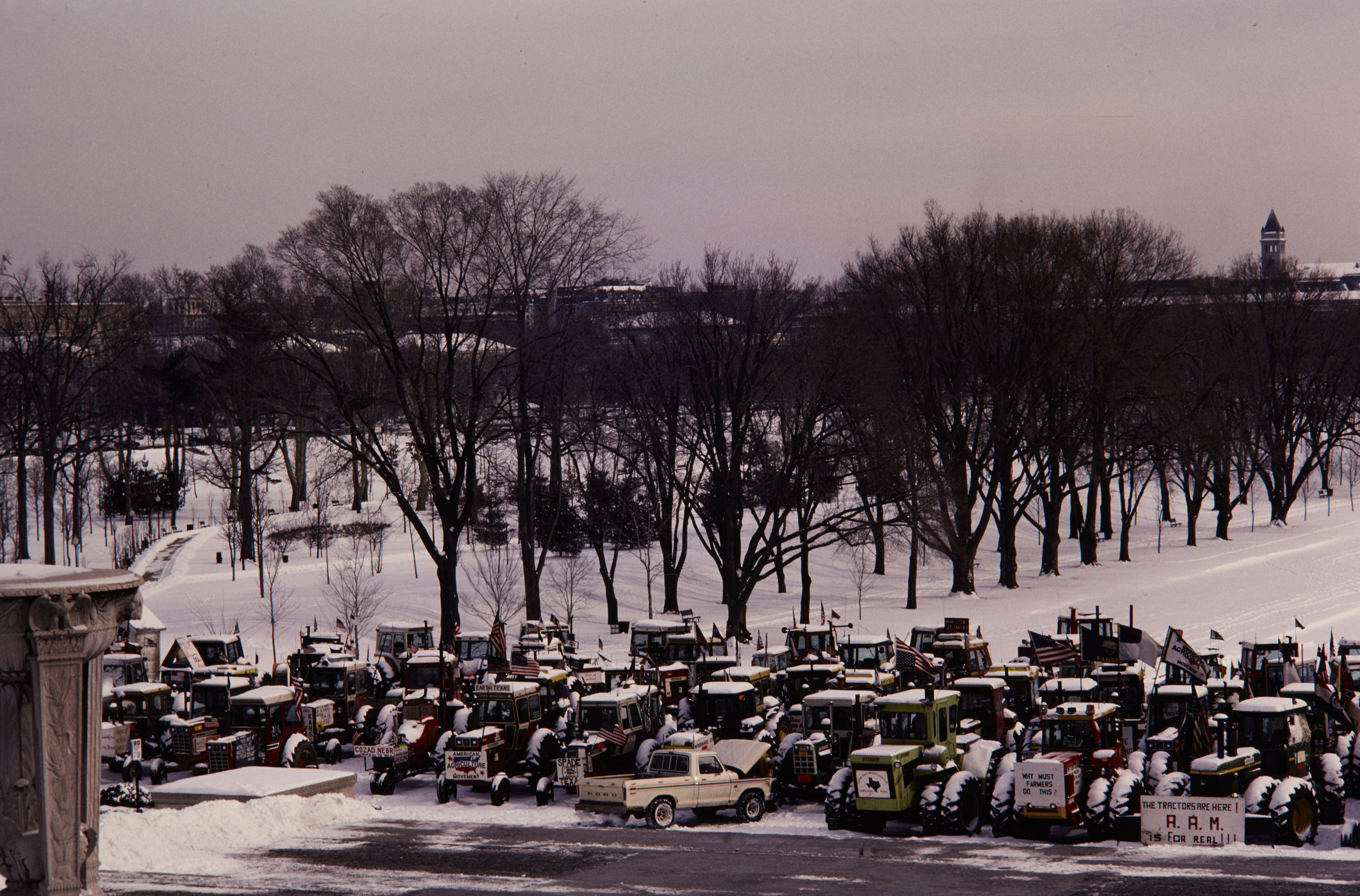 Demonstrations. Tractors lined up on the National Mall for an American Agriculture Movement demonstration.