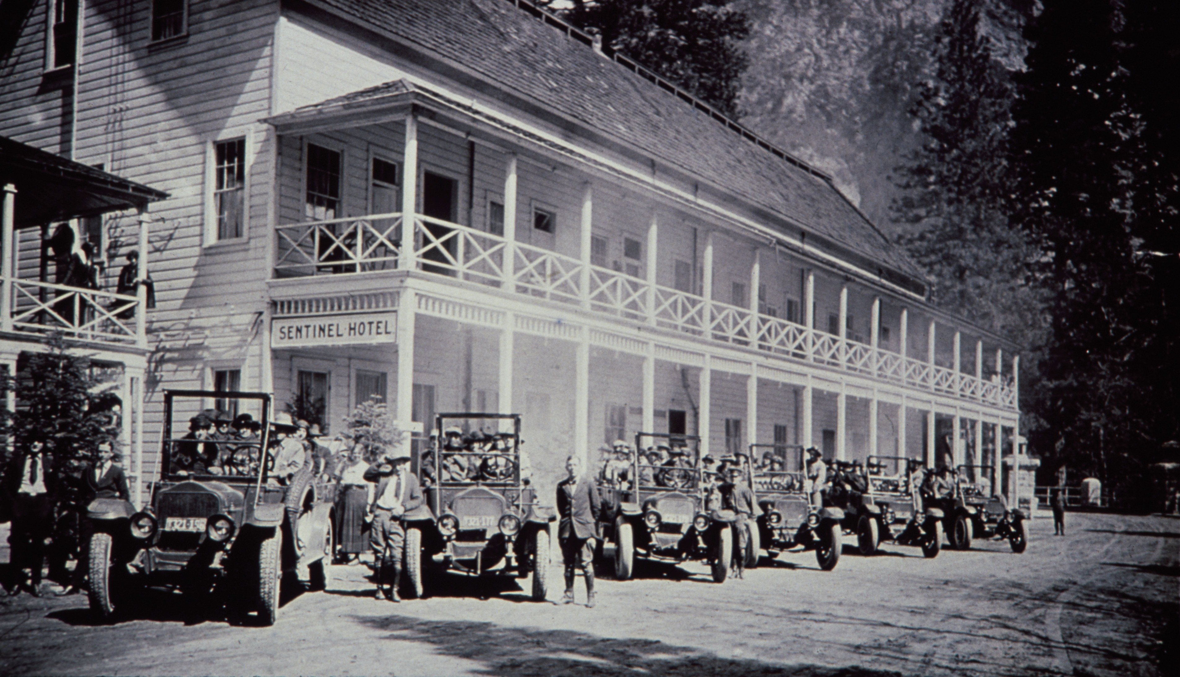 Visitors parked in cars outside the Sentinel Hotel in Yosemite National Park.