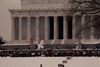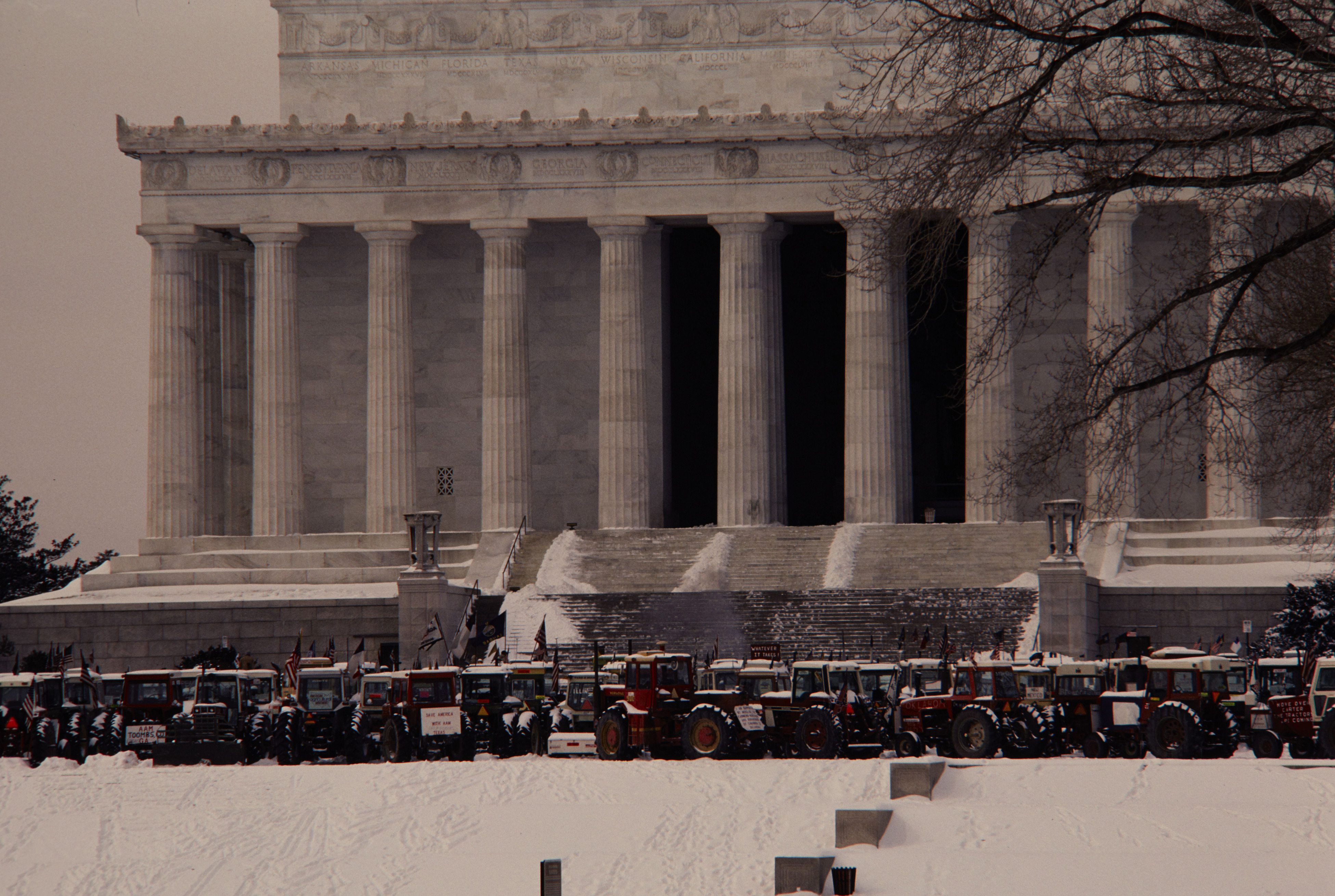 Demonstrations. Protest consisting of a line of tractors in front of the Lincoln Memorial during the Carter Administration as part of the American Agriculture Movement.