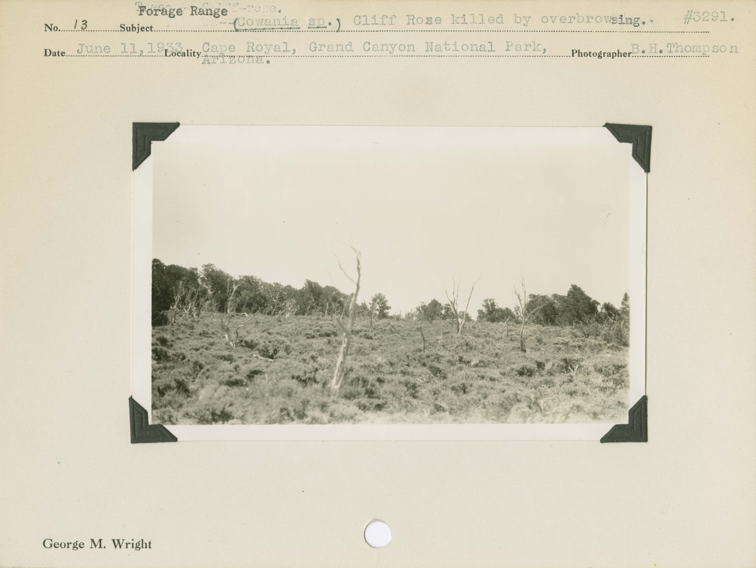 Forage Range -- Cliff-rose (Cowania sp.). Cliff Rose killed by overbrowsing. Locality: Cape Royal, Grand Canyon National Park, Arizona. Negative #: 3291
